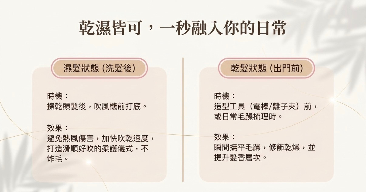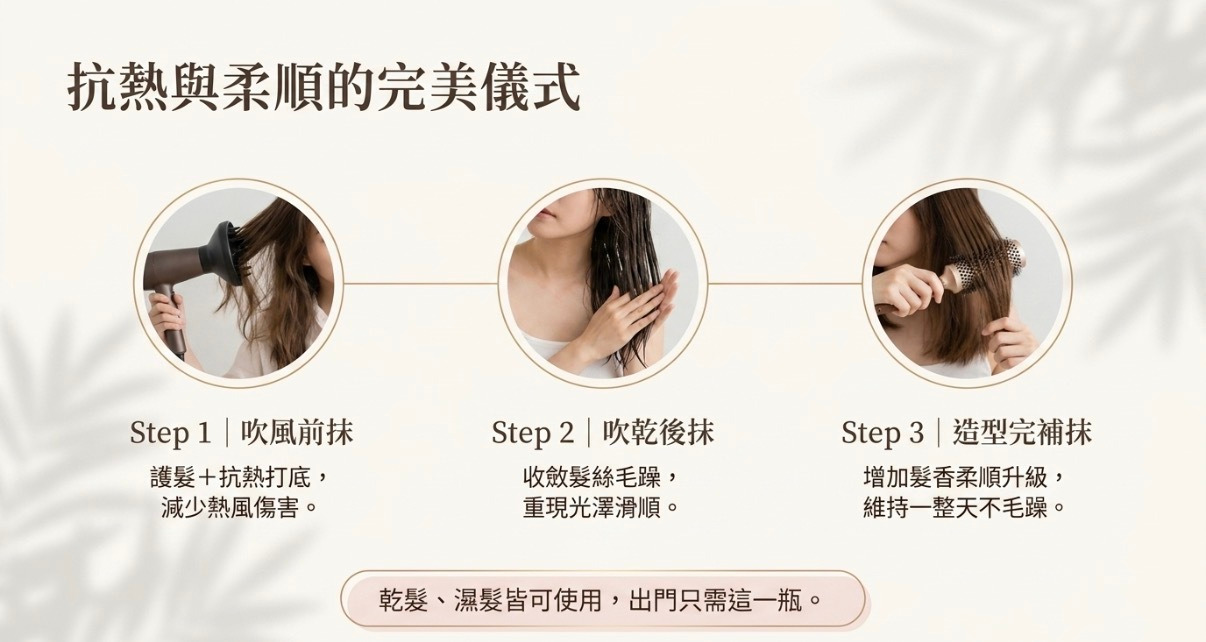 造型後輕噴或抹拭,即可為髮絲增添柔亮與香氛層次,讓日常保養兼具儀式感。