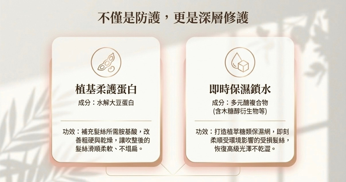 同時添加水解大豆蛋白與多元醣複合物(含木糖醇衍生物等)進行潤澤調理,讓受環境影響而顯得粗糙的髮絲恢復柔軟手感。