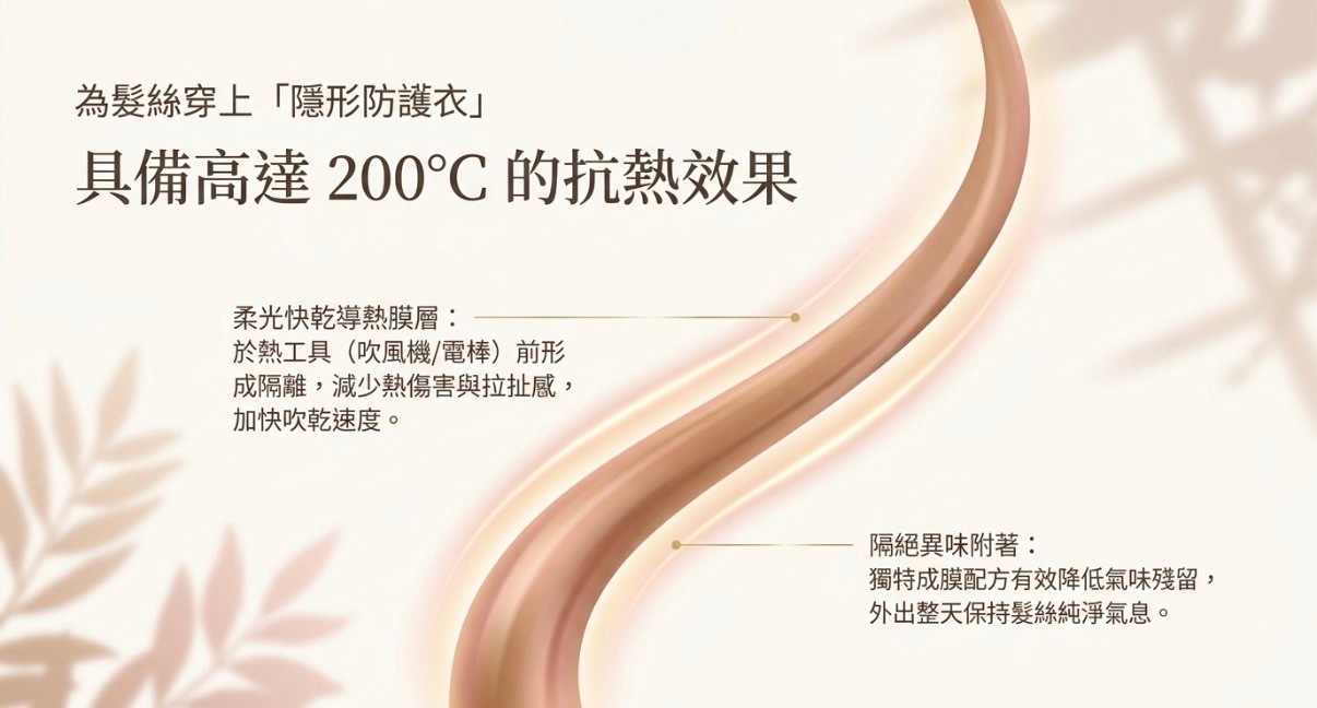 輕盈滑順的質地能迅速均勻延展,於髮絲表層形成細緻保護層,協助減少熱度造成的乾燥、拉扯感與毛躁,維持柔順與光澤度。
